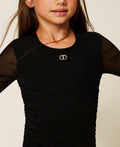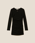 Abito giro collo a maniche lunghe foderato tranne che per le maniche, arriccio ai lati che migliora la vestibilità e logo oro sul davanti