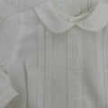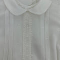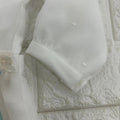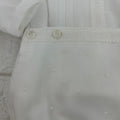 Completo due pezzi composto da camicia in organza con piccoli e delicati pois ricamati, pizzo al centro della camicia che ha il collo tondo e si apre dietro e pantaloncino modello culotte nello stesso tessuto, dettaglio in vita in pizzo, bottoncini in vita che uniscono la camicia con il pantaloncino creando un effetto pagliaccetto