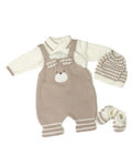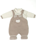 Tutina/salopette in pura lana con bretelle regolabili, orsetto sul davanti e maglia a polo in pura lana con profili a contrasto al collo ed ai polsi