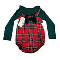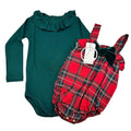 Salopette in tesuto fantasia tartan con fioccone in velluto e body in caldo cotone a maniche lunghe con rouche al collo