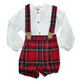 Salopette a gambe corte in tessuto fantasia tartan con vretelle e camicia a maniche lunghe con collo coreano