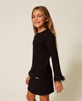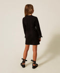 Abito a maniche lunghe e giro collo in punto milano con taschine sul davanti con applicazione metallica oro, piume staccabili ai polsi
