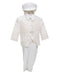 Completo 5 pezzi composto da: giacca senza collo in tessuto effetto shantung, gilet microfantasia con collo sciallato e bottoni nello stesso tessuto, camicia in cotone con collo classico, pantalone a sigaretta in tessuto effetto shantung con bottone e cerniera, papillon nello stesso tessuto della giacca e del pantalone. Cappello modello coppola coordinato
