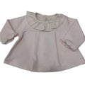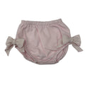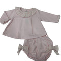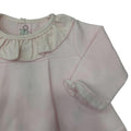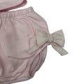 Completo due pezzi composto da felpa svasata con rouche fantasia micro righe al collo ed ai polsi e culotte in felpa con fiocchetti laterali in tessuto micro righe