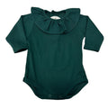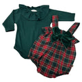 Salopette in tessuto tartan con maxi fiocco in velluto verde sul davanti e body in caldo cotone con rouche al collo