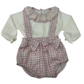 Salopette modello culotte fantasia vichy con fiocconi in vita e bretelle e maglia in cotone a nido d'ape con rouche al collo in tessuto vichy e pizzo