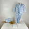 Completo elegante 5 pezzi composto da giacca in tessuto lurex a fantasia effetto pennellate, collo sciallato con profilo in tesuto lurex tinta unita, gilet e pantalone in tessuto lurex tinta unita, camicia in cotone a maniche lunghe e papillon nello stesso tessuto della giacca. Cappello modello coppola nel tessuto della giacca
