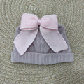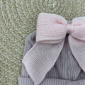 Cappellino in ciniglia a costine con risvolto e maxi fiocco in lana applicato