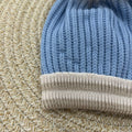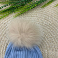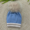 Cappellino in pura lana tutto lavorato a trecce con risvoltino a contrasto con righe e maxi pom pin in pelliccia di volpe