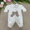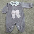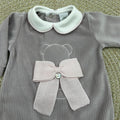 Tutina in morbida e calda ciniglia a costine con sagoma di orsetto ricamata e maxi fiocco in lana applicato