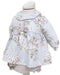 Camicia a body in cotone con colletto rotondo, abbottonatura sul davanti, parte sotto in jersey di cotone elasticizzato e, culotte in tessuto blu con sopra gonnellina in tessuto damascato bicolore e bretelle regolabili