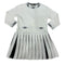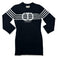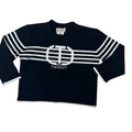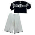 Completo due pezzi in viscosa composto da maglioncino ampio con righe a contrasto e logo di brillantini e pantalone ampio con bustino elastico