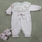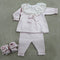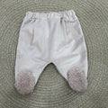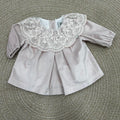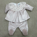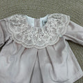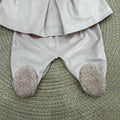 Completo due pezzi in ciniglia effetto velluto, maxi collo rotondo smerlato in pizzo, ghettina con elastico in vita e dettagli in tessuto teddy sotto ai piedini