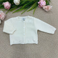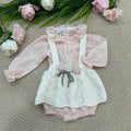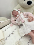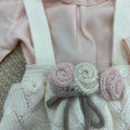 Set 4 pezzi composto da salopette in lana con bretelle regolabili, camicina in flanellina con rouche al collo e chiusura dietro, cardigan in lana e babbucce in lana coordinate con roselline in lana in rilievo