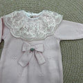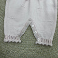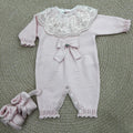 Tutina in pura lana con maxi collo in pizzo, fiocco in lana centrale, apertura dietro e all'interno gambe, babbucce in pura lana coordinate con fioccone in lana
