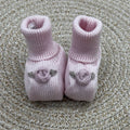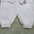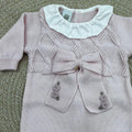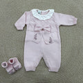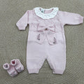 Tutina in pura lana con colletto tondo, corpino lavorato a rombi e maxi fiocco centrale con fiori ricamati e babbucce in lana coordinate con fiori ricamati