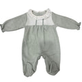 Tutina in cald cotone con fantasia a pois in rilievo nel tesssuto, corpino decorato da pizzo e rouche al collo. Apertura dietro e all'interno gambe