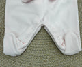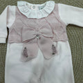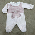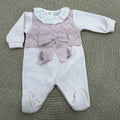 Tutina in morbida e calda ciniglia, corpino in pura lana lavorata con maxi fiocco centrale con fiori ricamati e colletto tondo a contrasto