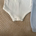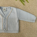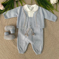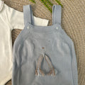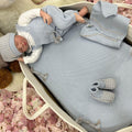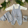 Set 4 pezzi composto da tutina/salopette con sagoma di testa di orso con sciarpetta al collo, body in caldo cotone a maniche lunghe con collo tondo con impunture a contrasto, cardigan in pura lana con profilo fantasia piccoli quadrettini e babbucce coordinate a fantasia di piccoli quadrettini