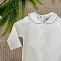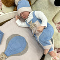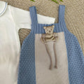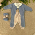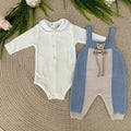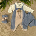 Set 4 pezzi composto da tutina/salopette con bretelle regolabili e apertura all'interno gambe, body in caldo cotone a maniche lunghe, cardigan in lana e babbucce inn lana coordinate