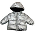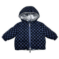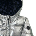 Giubbotto reversibile in nylon argento da un lato ed in nylon blu con quadratini in velluto liscio in rilievo con loghi
