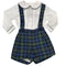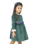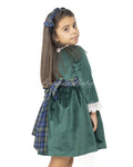 Abito giro collo a maniche lunghe con rouche di pizzo al collo ed alle maniche con cintura e maxi fiocco in tessuto fantasia tartan in vita