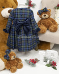 Abito giro collo a maniche lunghe con corpino interamente ricamato a mano a punto a smoch, rouche ai polsi e maxi fiocco dietro in velluto