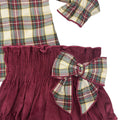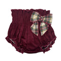 Completo due pezzi composto da camicia svasata fantasia tartan con maxi collo rotondo con ricamo effetto punto a smock e culotte in velluto mille righe con bustino elastico arricciato e maxi fiocco in vita nello stesso tessuto della camicia