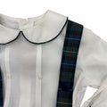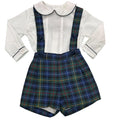 Salopette a gambe corte in tessuto fantasia tartan con bretelle e camicia con collo tondo profilato con lo stesso tessuto del bermuda