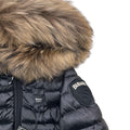 Gubbotto lungo con cappuccio non staccabile con bordo in pelliccia naturale, traountatura orizzontale, logo sul braccio ricamato nelle taglie 2/4/6 e di brillantini nelle taglie 8/10/12/14/16