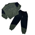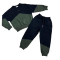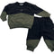 Tuta due pezzi felpata composta da felpa giro collo bicolore con spadino sul davanti e stampa maxi logo dietro e pantalone bicolore, bustino completamente elastico e spadino sulla gamba