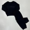Jeans nero a tela rigida (non elasticizzato), bustino con elastico regolabile interno e stampa logo con multi loghi sul dietro. Chiusura con bottone e cerniera