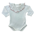 Body in caldo cotone a maniche lunghe con rouche al collo smerlata e profilata a contrasto con arriccio effetto punto a smock