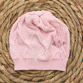 Cappellino in pura lana lavorata a rombi con rosellina in rilievo ricamata