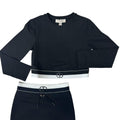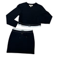 Completo due pezzo composto da t-shirt crop in cotone giro collo a maniche lunghe con elastico bicolore logato e gonna in neoprene con elastico bicolore logato in vita