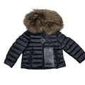 Giubbotto in piuma d'oca con cappuccio non staccabile con bordo in pelliccia naturale, trapuntatura orizzontale, logo sul braccio ricamato nelle taglie 2/4/6 e di brillantini nelle taglie 8/10/12/14/16