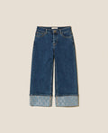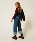 Jeans elasticizzato con gamba ampia, lavaggio medio, risvoltone sul fondo tutto logato con strass, chiusura con bottone e cerniera, tasche sul retro