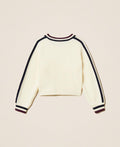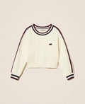 Maglione giro collo in lana a costine con profili a contrasto al collo ed ai polsi e bande sulle maniche