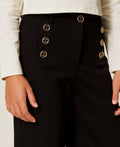Pantalone in punto Milano a vita alta, chiusura con bottone e cerniera, gamba ampia e bottoni oro decorativi sul davanti