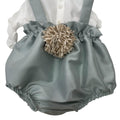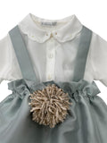 Salopette modello culotte a sbuffo con bretelle regolabili e staccabili e camicia a body in tessuto effetto seta, collo smerlato con piccoli pois ricamati, pom pon in vita