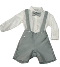 Salopette con bermuda all'inglese impreziosita da bottoncini in madreperla, bretelle regolabili e staccabili, camicia a body in cotone e papillon nello stesso tessuto del bermuda