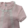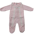 Tutina in caldo cotone con doppia rouche al collo e salgallo su tutto il davanti. Apertura dietro e all'interno gambe