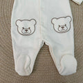 Tutina in morbido e caldo interlock felpato, chiusura anti panico sul davanti, collo a polo e simpatiche tasvhe a sagoma di orso, apertura dietro e all'interno gambe